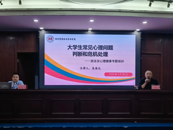 为进一步提升学院班主任对学生心理健康问题的识别与应对能力,3月26日晚上,经济管理学院特别邀请湖州三院心理治疗师吴佳元,带来了一场主题为《大学生常见心理问题判断与危机处理》的精彩讲座,讲座由学院党委副书记主持,全体班主任、辅导员以及学院心理互助中心的学生参加本次讲座。