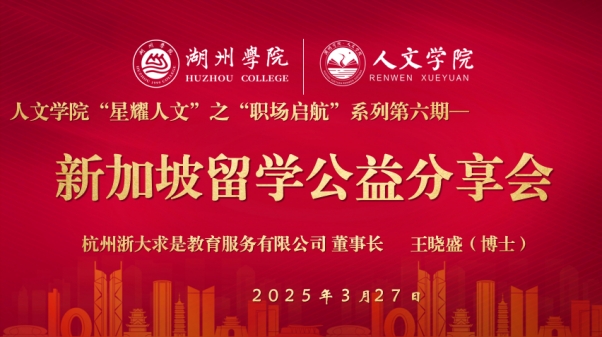 为帮助我院学生拓展国际视野,了解海外留学与就业前景,2025年3月27日下午,由党委学工部主办,人文学院承办新加坡留学公益线上分享会顺利举行。活动特邀杭州浙大求是教育服务有限公司董事长、亚太教育文化委员会执行董事王晓盛博士作为主讲嘉宾。会议由人文学院学工办副主任、就业辅导员主持。