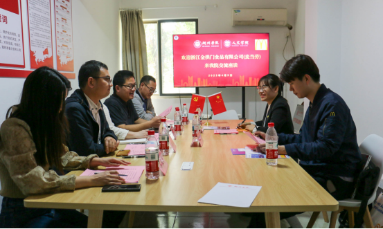 2025年4月9日下午,人文学院与浙江金拱门食品有限公司(简称“麦当劳”)在党建中心204举行《大学生就业基地协议》签约暨授牌仪式。麦当劳浙江市场招募中心负责人柳丽、招募中心主管张昊,人文学院党委副书记、纪委书记,学工办副主任、就业辅导员,湖学研究院研究员、人文学院纪检监察员,廉情监督员,校语委办秘书长等参加仪式。