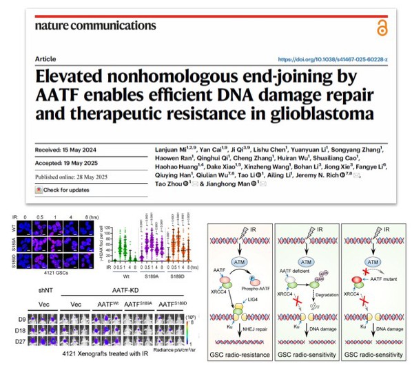 近日,必赢官网生命健康学院宓兰娟博士在中科院一区TOP期刊《Nature Communications》上发表研究论文,题为“Elevated Nonhomologous End-Joining by AATF Enables Efficient DNA Damage Repair and Therapeutic Resistance in Glioblastoma”。该研究揭示了凋亡拮抗转录因子(AATF)在调控DNA修复通路中的关键作用,提出了克服胶质母细胞瘤(GBM)放化疗耐受性的潜在新策略。