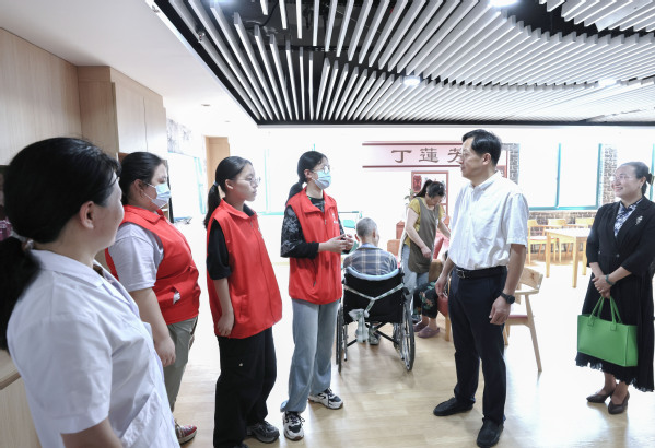 金波一行先后走进康复治疗大厅、“梅好工作室”和认知症专区等区域,与师生们进行了亲切的互动交流,详细了解了他们的实践情况,勉励大家要珍惜此次学习实践的机会,在实践中成长进步,同时表达了学校对他们对关心和慰问。