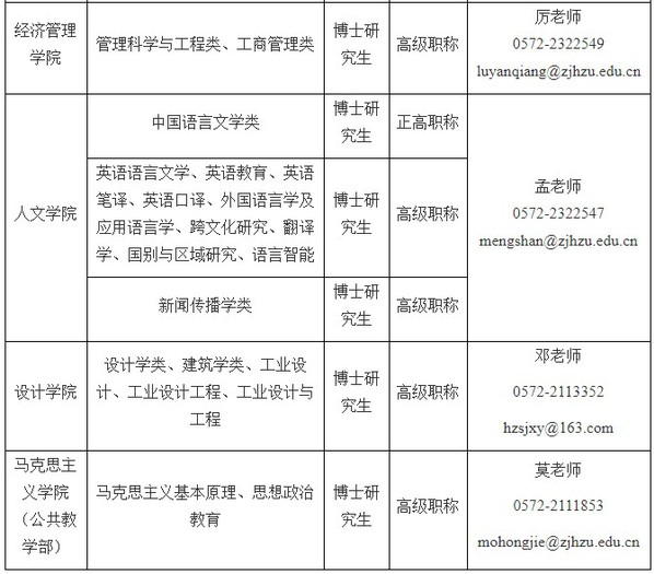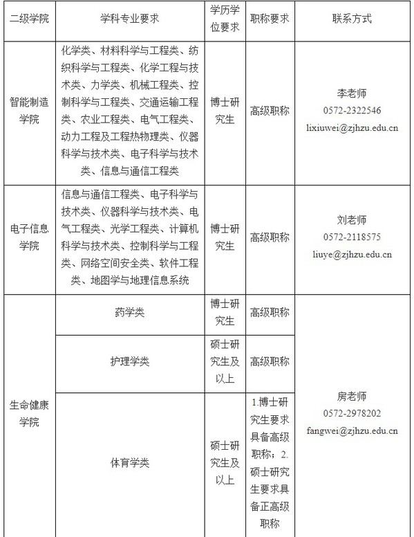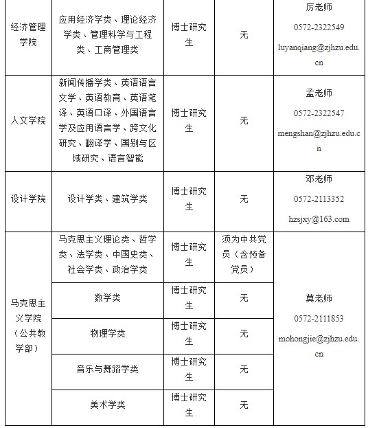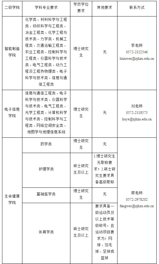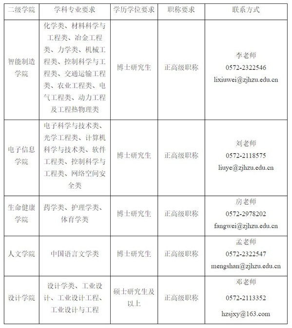 各层次人才引进类别相应要求及待遇情况,可致电437437必赢国际网址人事处。联系电话:0572-2322556(陈老师)